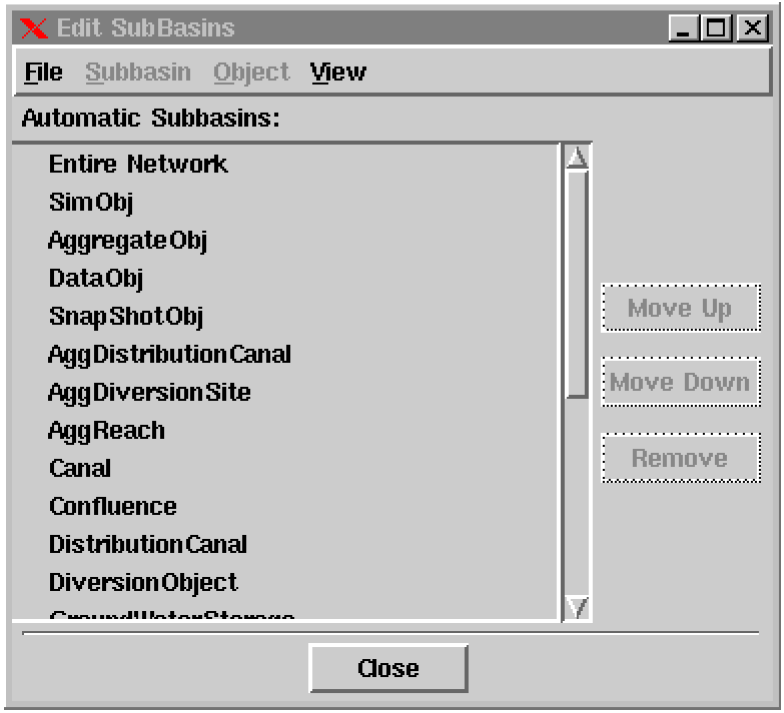 The Subbasin Manager has been completely redesigned to facilitate growing needs, but no changes to existing models are necessary. The Subbasin Manager, invoked by selecting Workspace Edit SubBasins... from the main RiverWare menu bar, now has two views, User-Defined SubBasins and Automatic SubBasins. The views are selected in the SubBasin Manager’s View menu. The default view is the automatic subbasins view shown below: