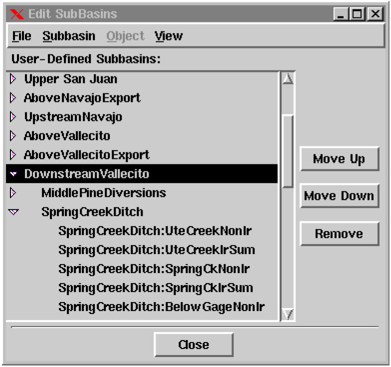 Automatic subbasins are generated by RiverWare and may not be renamed or reordered, or have their members modified or reordered. User-defined subbasins are defined by the user and saved in the model file. They may be renamed and reordered, and their member objects may be modified and reordered. A sample user-defined subbasin view is shown below: