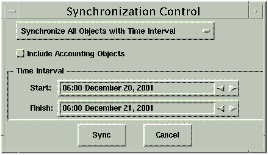 A new dialog was added to enhance the ability to synchronize workspace objects to a specified time interval. Previously, there were menu options to synchronize all or selected objects to the run control. Now, there is a dialog box (see below) that allows the user to synchronize all or selected objects with the run control or to a specified time interval. A toggle button was also added to the same dialog to allow users to synchronize the timesteps or time interval for accounting slots on all or selected objects. The new time interval must encompass the run control time interval.