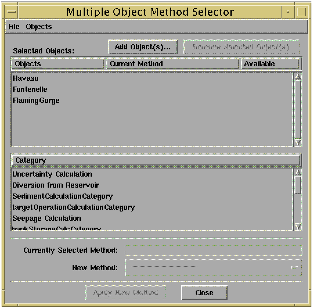 • Open the Multi-Object Method Selector from the main RiverWare menu: “Workspace” -> “Objects” -> “Select Methods on Objects...”