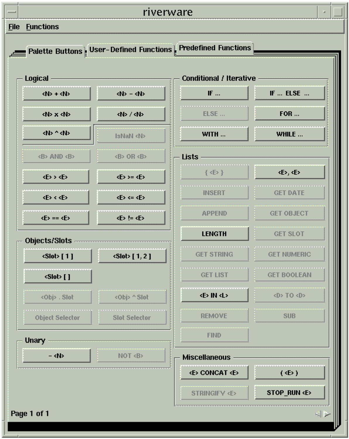 The rules palette has been re-designed for ease of use. Below is a screen shot of the new palette. The palette buttons are still located on the main palette view. However, now there are separate tabs for the rules functions. The first tab is the main palette view, the second tab is for User-Defined Functions (added to the ruleset by the user), and the third tab is for pre-defined functions in RiverWare. These are now grouped by type instead of listed in alphabetical order. The user can switch between the group view and the function view using the Functions menu. Also in the Functions menu is a search mechanism which will search for a string in a function’s name, description, and/or definition.