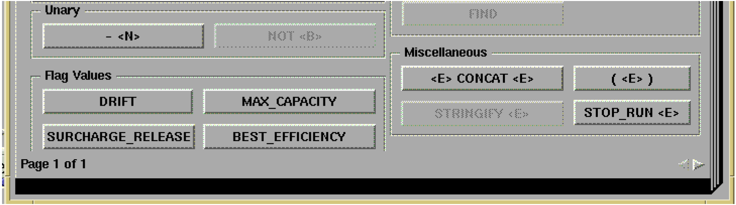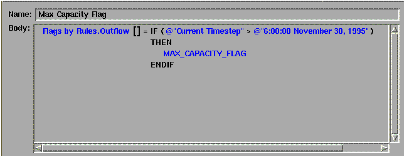The RiverWare Policy Language has been enhanced to allow rules to set special flags on series slots. The only flags which may be set are those which have the semantics “considered known (when the object is selecting a dispatch method) but are actually computed by the object at dispatch time”. These include the Surcharge Release, Max Capacity (for both Outflow and Energy), Best Efficiency and Drift. Each flag now has its own palette button for rule building. Below is a screen shot of the flag value buttons at the lower left corner of the palette. Also an example of a rule that sets a flags is given.