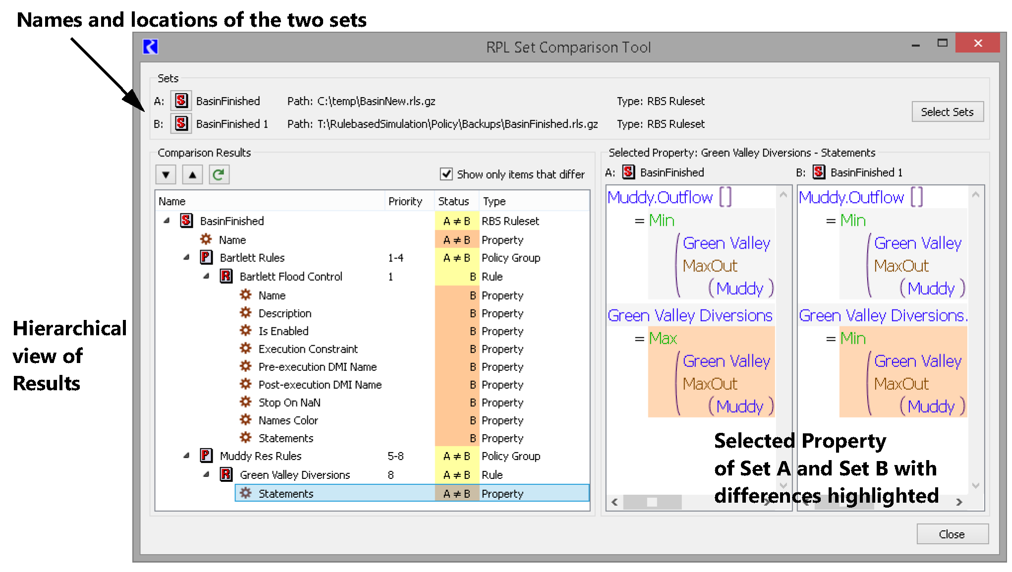 A screenshot of the tool is shown below. For more information, see Comparing RPL Sets in RiverWare Policy Language (RPL).