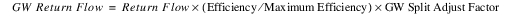 The Split Return Flow Efficiency Method splits Return Flow into surface and groundwater components according to the computed Efficiency, Maximum Efficiency, and the GW Split Adjustment Factor. This method is based on the USBR return flow split calculation. The groundwater portion of the Return Flow is found by: