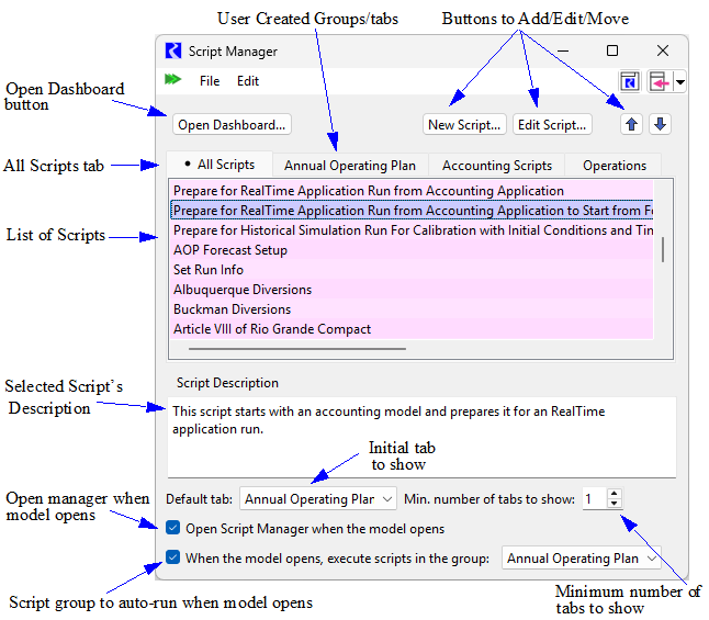 • Specify which script group tab is initially displayed by selecting a script from the Default tab menu. That tab is shown when the Script Manager window is initially opened (either upon model load or manually) within a RiverWare session.