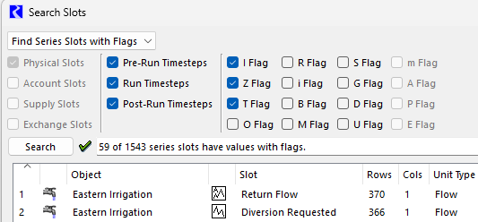 The Search Slots tool was enhanced to find slots with any selected flag. Previously the tool was limited to finding slots with inputs (I, Z, or T flag). You can now specify any set of flags for the search. The tool is accessed from the Workspace, then Slots, then Find Flags menu. (Previously the menu item was Find Inputs.)