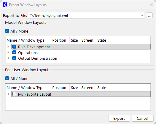 In the panels, specify the Model Window Layouts and/or the Per-User Window Layouts to export. These are tracked separately in the exported file.