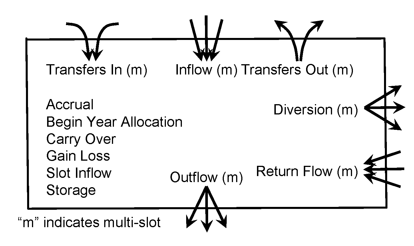 Figure 2.1 shows the general slots on the Storage Account. The arrows leading into and out of the account represent supplies. The “m” indicates the slot is a multi-slot, which can be linked to more than one other slot, as represented by the multiple arrows.