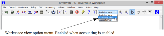 The accounting view provides a representation of the physical objects, as well as, the accounts on those objects. The first time the user switches from the Simulation View to the Accounting View, RiverWare uses the location of the objects to create a default layout in the accounting view. This default layout is similar to the Simulation View but typically, the user must rearrange objects and accounts to get a realistic and usable layout.