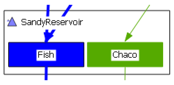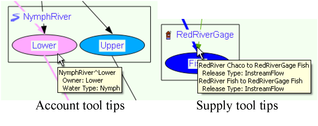 The accounting view can represent the four account types: storage accounts, passthrough accounts, diversion accounts, and instream flow accounts. Storage accounts are represented by rectangular icons, pass through accounts are represented by elliptical icons, diversion accounts are represented by an isosceles trapezoid, and instream flow accounts are represented by a pointed rectangle. The account name is presented within its icon; however, if the account name is too long to fit within its account icon, the name is truncated and marked with an asterisk (*). Supplies are represented by a line between two accounts with the directional supply-demand relationship represented by an arrowhead on the demand-side of the supply. Supplies between accounts on the same object (transfers) are represented by a curved line.