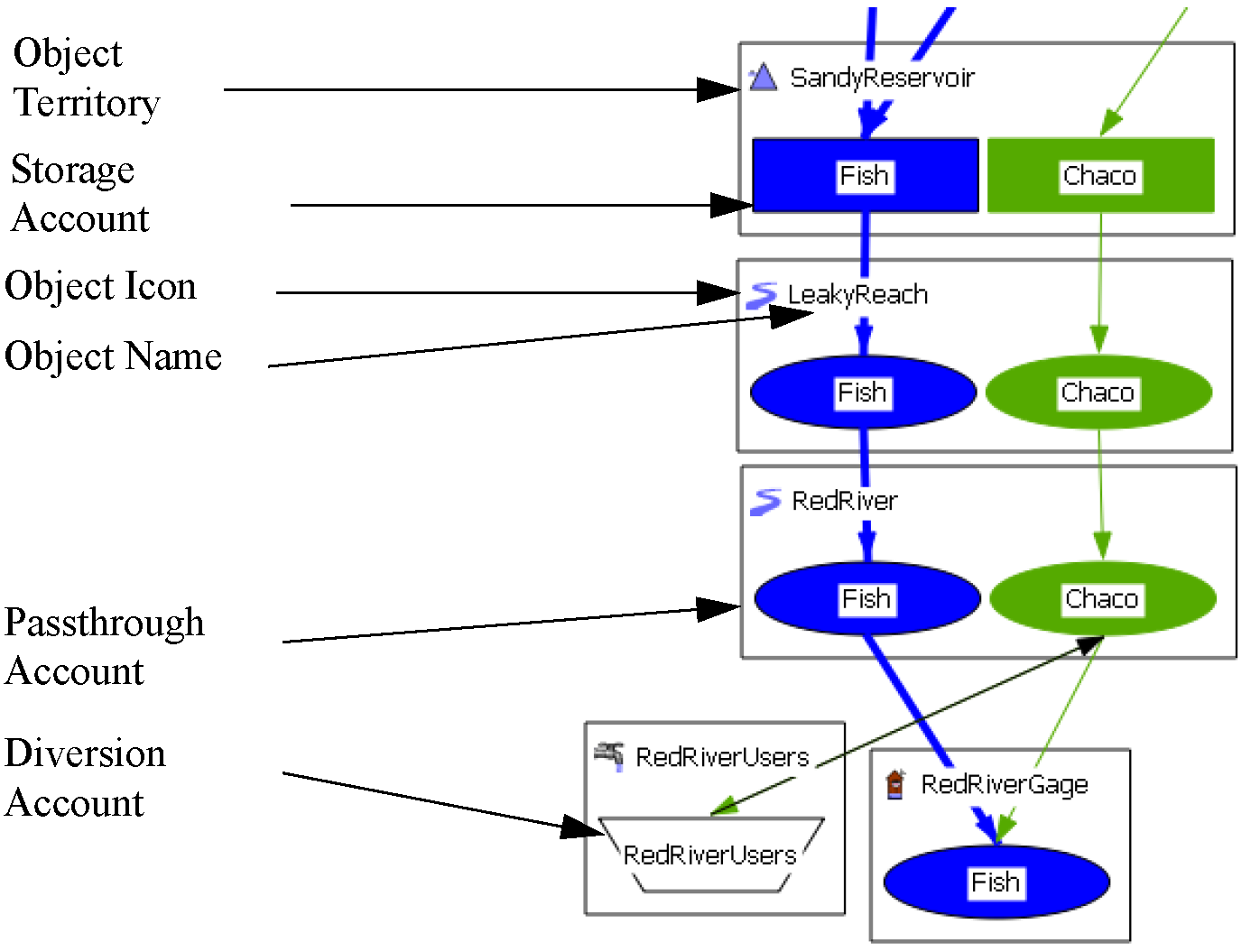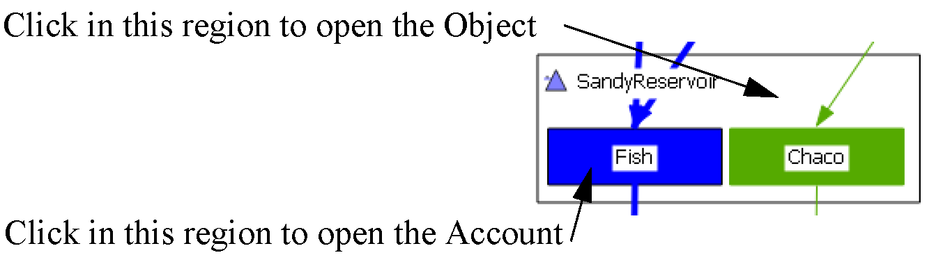 object territory of its parent simulation object, providing a spatial association of the account with its simulation object. An object territory is a rectangular box with the object icon and name in the upper left corner. Icons representing the accounts on that simulation object are displayed within the territory in a single row. The position of the accounts in the territory are configured through a drag and drop operation; however, RiverWare provides an initial default ordering, as shown in