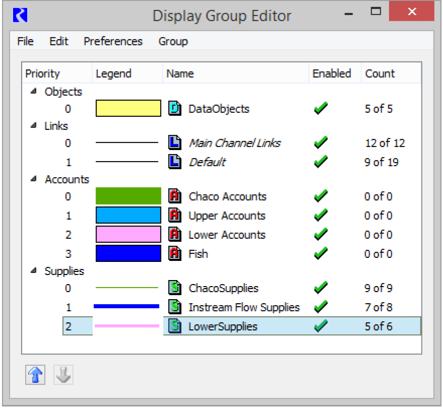 The Display Group Editor provides the ability to create groups of links, groups of objects, and if accounting is enabled, groups of supplies and groups of accounts. The display properties (including color, line width, shading, etc.) and the membership of a group can be changed by double-clicking that group. The membership of the groups need not be mutually exclusive. The groups are prioritized. For example, if two link groups contain the same link, the group highest in the list (lowest priority number) will be used to set the display properties of that link. Display groups can be enabled and disabled by selecting the check mark in the Enabled column.