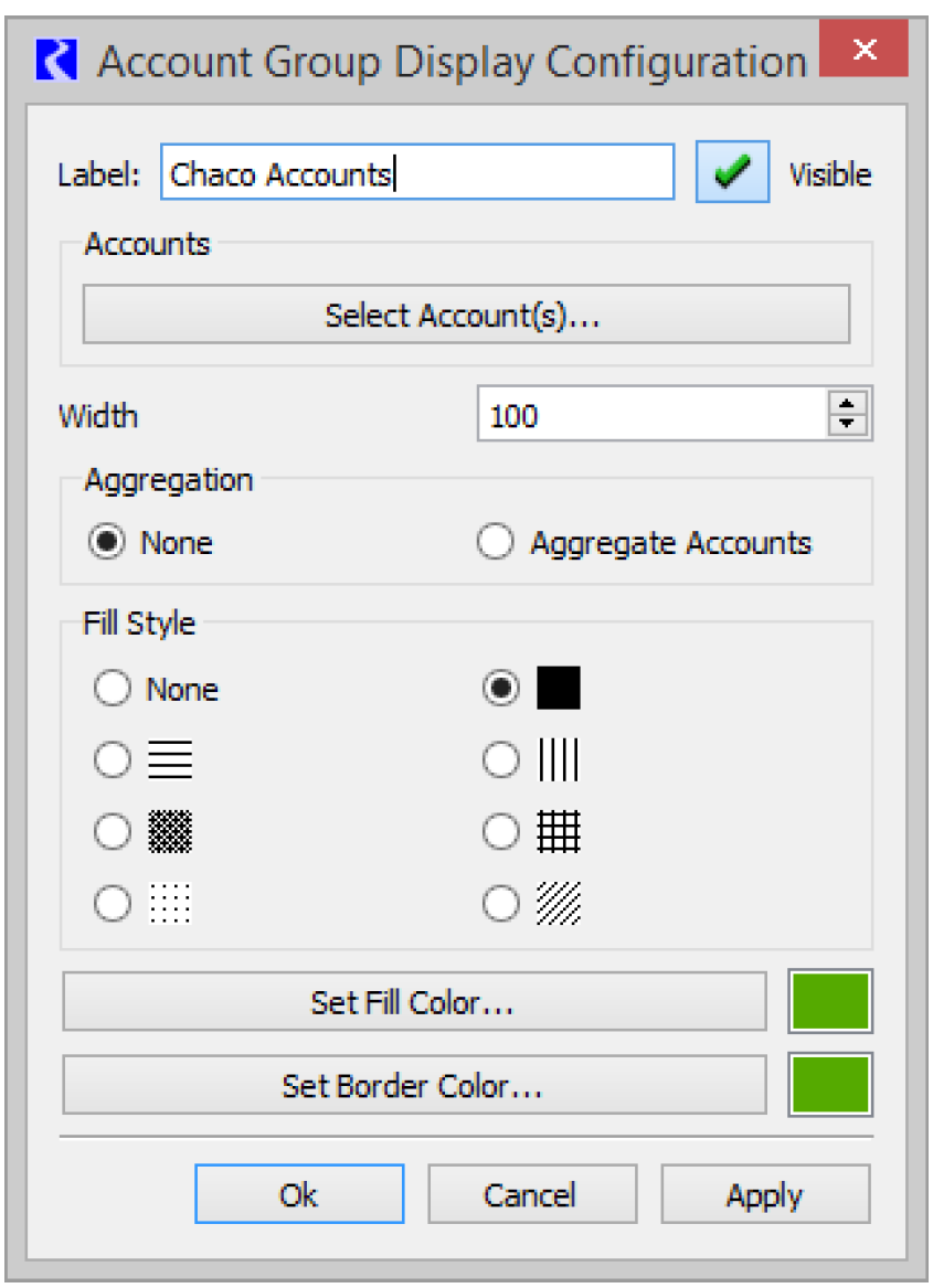 The membership of the group and the fill style, fill color, account width, account aggregation, and border color of the group members can be set with this dialog. The membership of Accounts within the group is controlled by selecting the Select Account(s) button. The selection uses the standard Object/Slot/Account/ selector dialog and wild cards and filters can be used to select the appropriate accounts. An account can also be added to an Account Display Group by right-clicking the account on the workspace, mousing over Add to Account Group, and selecting the desired Account Display Group. If the account is already a member of an Account Display Group, this option will be replaced with Account Group Membership. Mousing over this option will show the display group to which the account belongs.