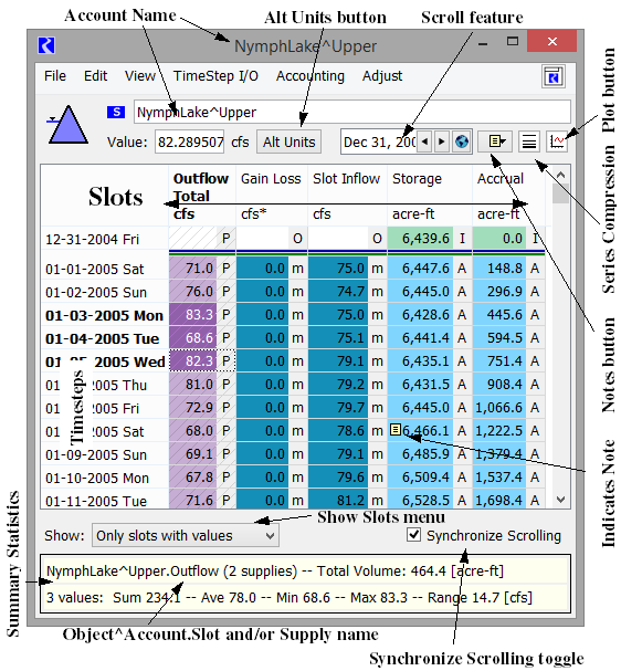 On the top of the dialog, the account name is given in the form Object^Account. There is an icon for the object type on which this account resides. In this case, it is a Storage Reservoir. In addition, there is an icon that shows the type of this account; that is, a storage account. On the left side of the dialog are the timesteps for the accounting system. Each column in the table represents a slot that may contain data.