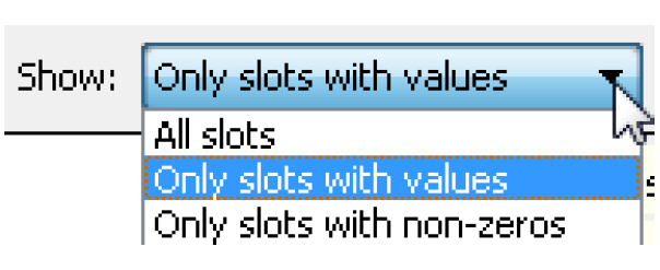 The slots displayed in this dialog depends on the type of account; that is, storage, passthrough or diversion. Additionally, the Show menu allows you to specify whether to show All Slots, Only Slots with values (non NaNs) or Only slots with non-zero values.
