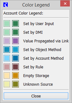 Accounting dialogs use colors to represent the process used to set the accounting values. A key is provided that shows the meaning of each color.