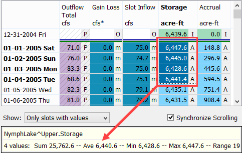 At the bottom of the dialog, the summary information says that the average is 6440.6 acre-ft, as shown in Figure 3.13. It also displays that the NymphLake^Upper.Storage account is selected.