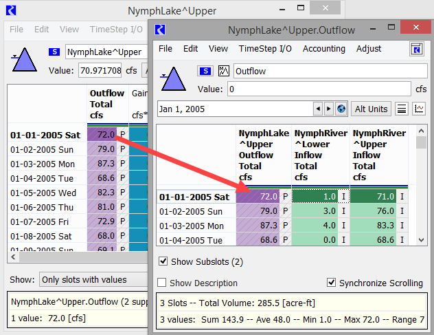 Outflow, Inflow, Transfers, Diversion, and Return Flow slots on the Edit Account dialog can actually consist of more than one value if the user has configured to have multiple supplies coming into or out of that slot. We will discuss this in detail later. For now, let us just be aware that a column can represent more than one time series of data. If a column in the Edit Account dialog does in fact have multiple components, the column in the Edit Account dialog will be cross hatched meaning it is read-only. Double-clicking the column opens a new windows showing the multi-slot which consists of the total sum and the component supplies.