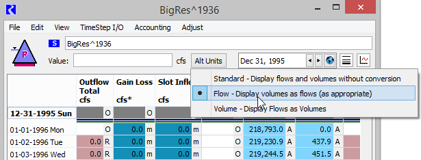 Select Flow to see the flow values as a volume. Notice that the values have changed and the columns now say acre-feet instead of cfs. The value shown is the volume over the timestep. Slots on accounts use the active Unit Scheme for display and input; see Unit Schemes in User Interface for details. As with the physical system, the accounting system maintains its values in internal units, regardless of the units chosen for display.