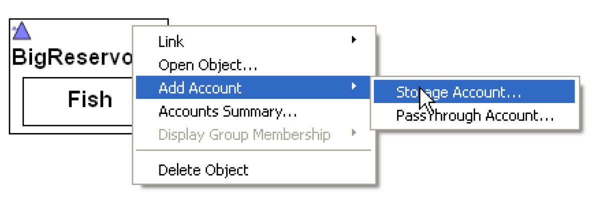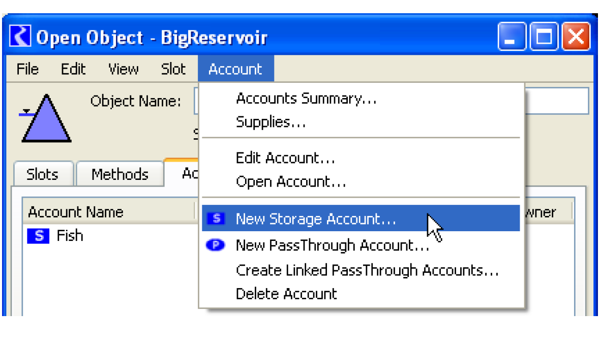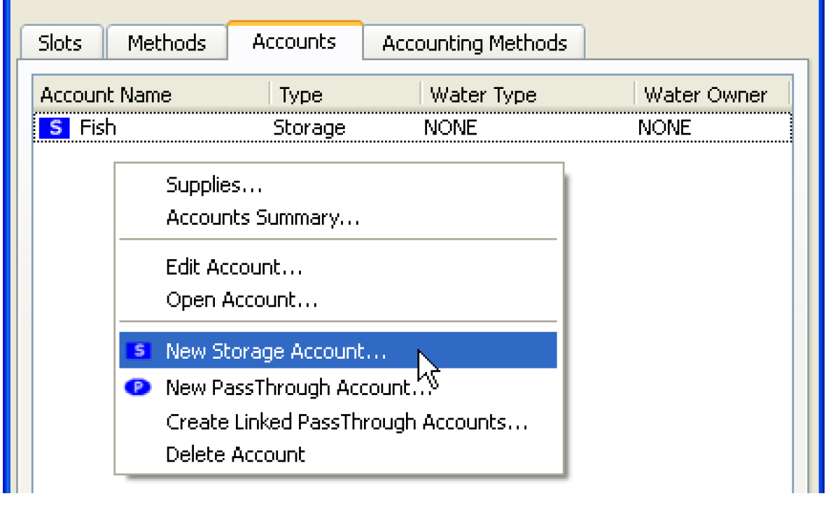 • Within the object dialog, switch to the Account tab then select the menu Account, then New Storage/PassThrough/Diversion/InstreamFlow Account. If you are on an aggregate object, you will need to highlight one of the elements to which the Account will belong.