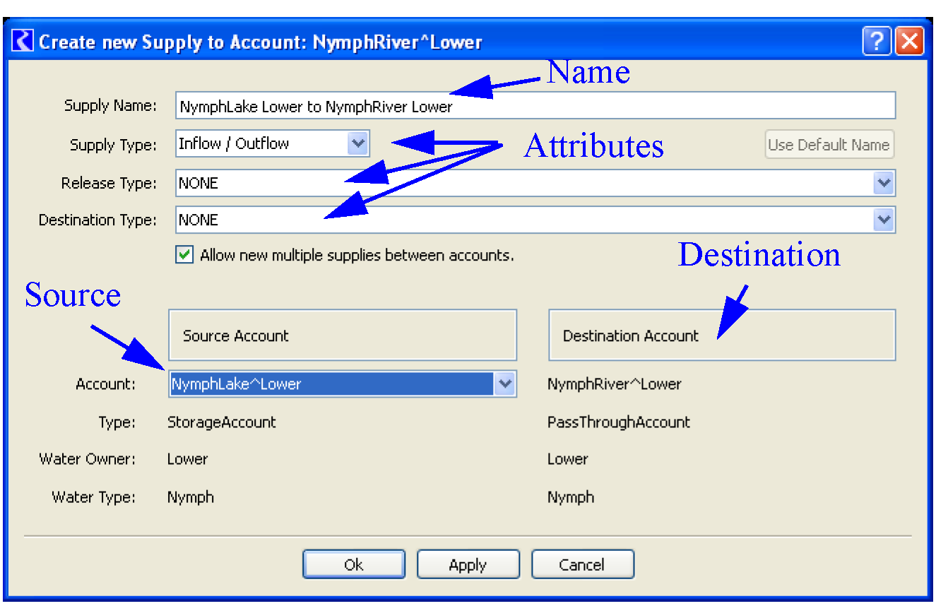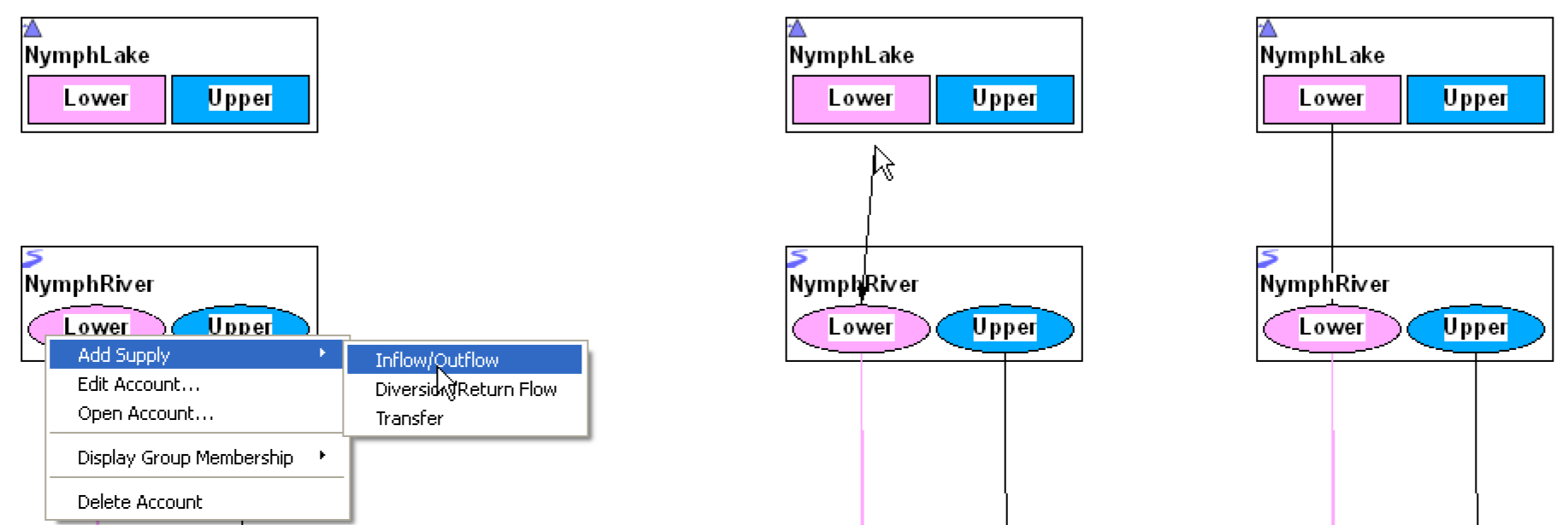 • Right-click on the Account in the Accounting View workspace, then choose Add Supply and then the desired supply type. An arrow appears for the user to select the source. Figure 3.15 illustrates these steps. Right-click on the source account and create the supply. The default supply name and properties are used. If you desire to change these, you must use either the Edit Supply (from the Supplies tab in the Open Account dialog) or the Supplies Manager to change names or properties. If the source account is more than one link upstream, the Create Linked PassThrough Accounts dialog will appear to create linked Passthrough accounts.