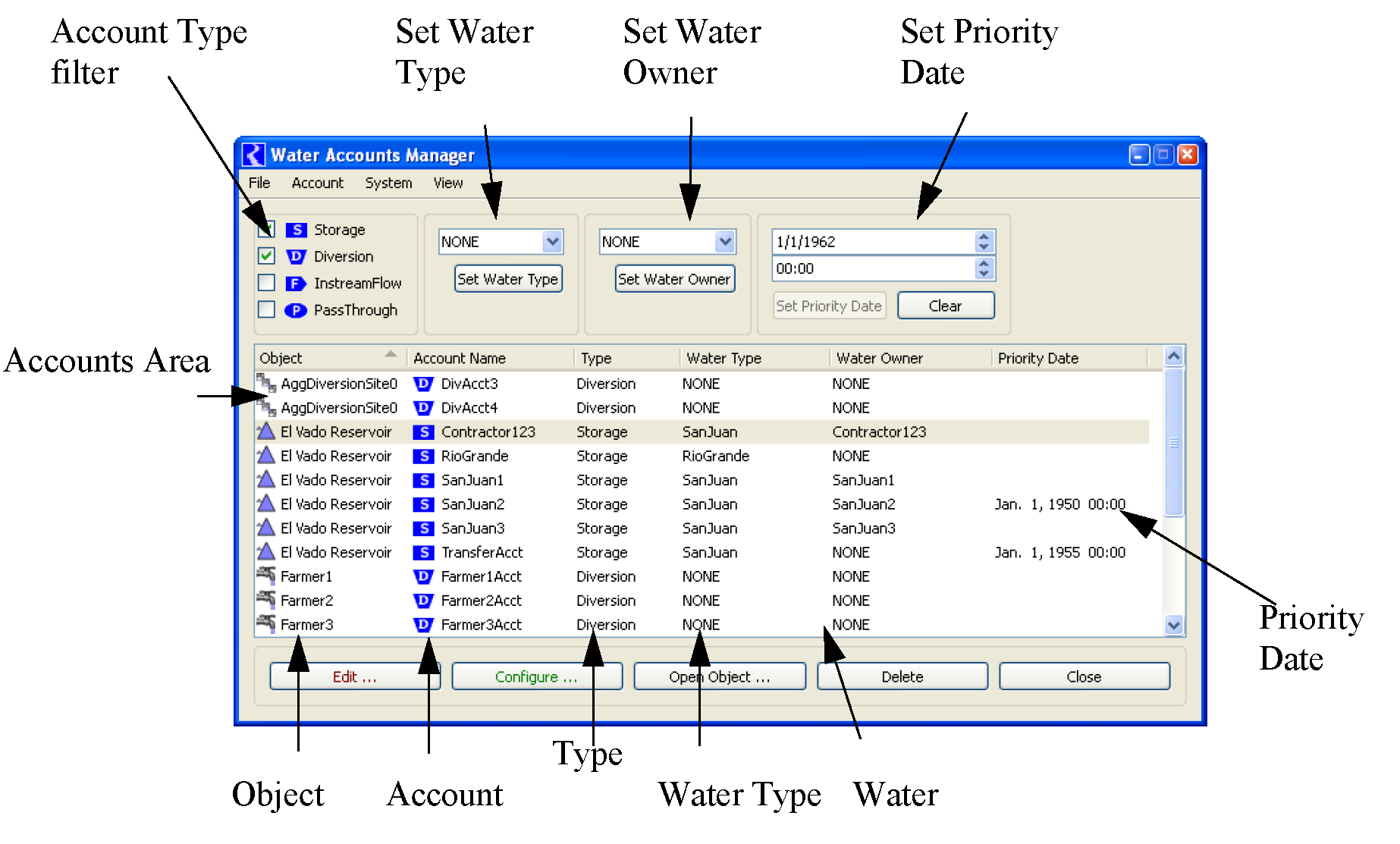 The Water Accounts Manager displays one account per row. Sortable columns display the Object, Account Name, Water Type, Account Type, Water Owner, and Priority Date, if applicable. Following are descriptions of the buttons, toggles, and features of the utility.