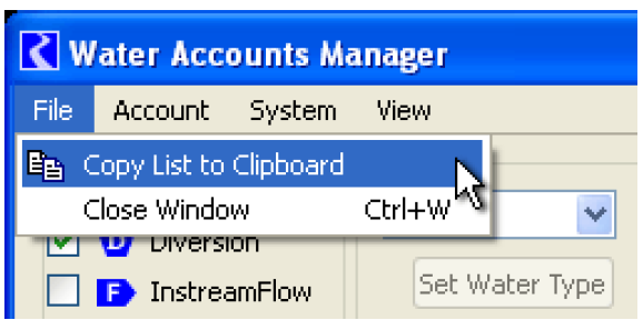 The menu operation File, then Copy List to Clipboard copies a tabular string representation of the currently displayed Account list to the System Clipboard. Fields are delimited with Tab characters, lines are delimited with New Line characters, suitable for importing into a spreadsheet, such as Microsoft Excel.
