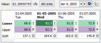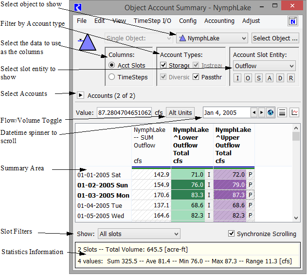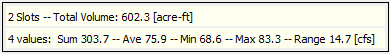 The following summary statistics are displayed for the highlighted selection: Sum, Average, Minimum, Maximum, and Range.If the slot entity shown is a Flow slot, then the summary area also shows the sum of the selected cells converted to a volume.