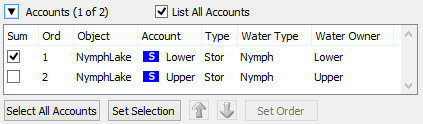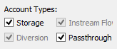 Accounts can be filtered by type; that is, Storage, Diversion, Instream Flow or Passthrough, using the check boxes. The check boxes are enabled based on the types of accounts that reside on the object.