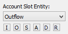 The slot entity (Outflow, Inflow, Storage, etc.) shown in the summary area is selected using the menu. The most common slot types can be quickly selected using buttons: I = Inflow, O = Outflow, S = Storage, A = Accrual, D = Diversion and R = Return Flow. Use the menu to select other slot entities on the object.