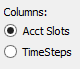 Show timesteps as either the column or the rows. If Acct Slots is selected, the accounts are shown across the columns and timesteps go down the rows. See Slots For Columns. If Timesteps is selected, the timesteps are displayed across the columns and the accounts displayed down the rows in the table. See Timesteps for Columns for more information.