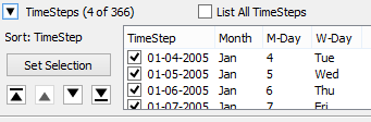 Select the List All Timesteps toggle to show all of the timesteps in the model. Use the arrows to navigate through the model’s timesteps. Select the desired timesteps by checking the box to the left of the timestep. Select the Set Selection button to apply your choices and update the summary area. The summary area becomes similar to .