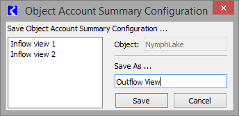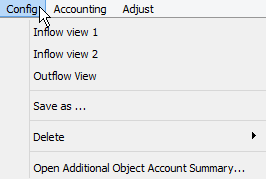 This configuration is saved with the model file. To apply the configuration to an Object Account Summary, use the Config menu and select the previously defined configuration name. In Figure 3.29, there are three configurations saved, “Inflow view 1”, “Inflow view 2”, and “Outflow View”.