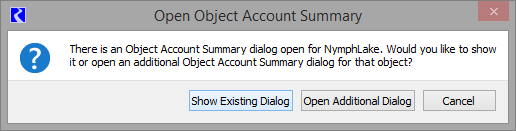 In all but the last case, if there is already an Object Account Summary dialog open for the object, a confirmation is presented to either open the existing dialogs or open additional dialogs.