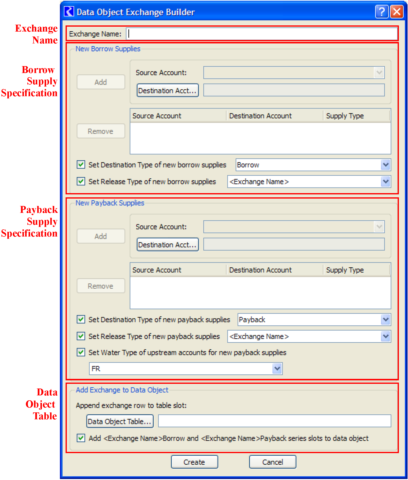 Payback Supply Specifications are created with controls that behave the same as those described above for borrow specifications. (9-11) At least one payback supply must be specified to create a data object exchange.