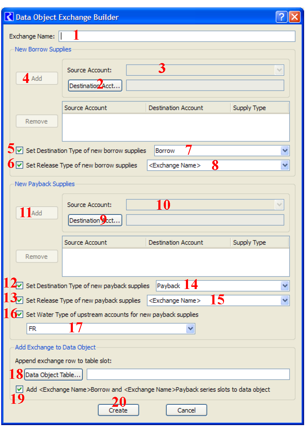 The New Payback Supplies frame of the dialog also has check boxes for optionally setting the destination type (12) and release type (13) of the new payback supplies. The Destination Type combo box (14) is populated with all the destination types defined in the model plus a type called “Payback” if it does not already exist. The Release Type combo box (15) is populated with all release types defined in the model plus a type with the name of the exchange. The New Payback Supplies frame also has a check box (16) to optionally set the water type of upstream accounts of the new payback supplies. The Water Type box (17) is populated with all the water types defined in the model, plus this box allows typing in a new water type, if desired.