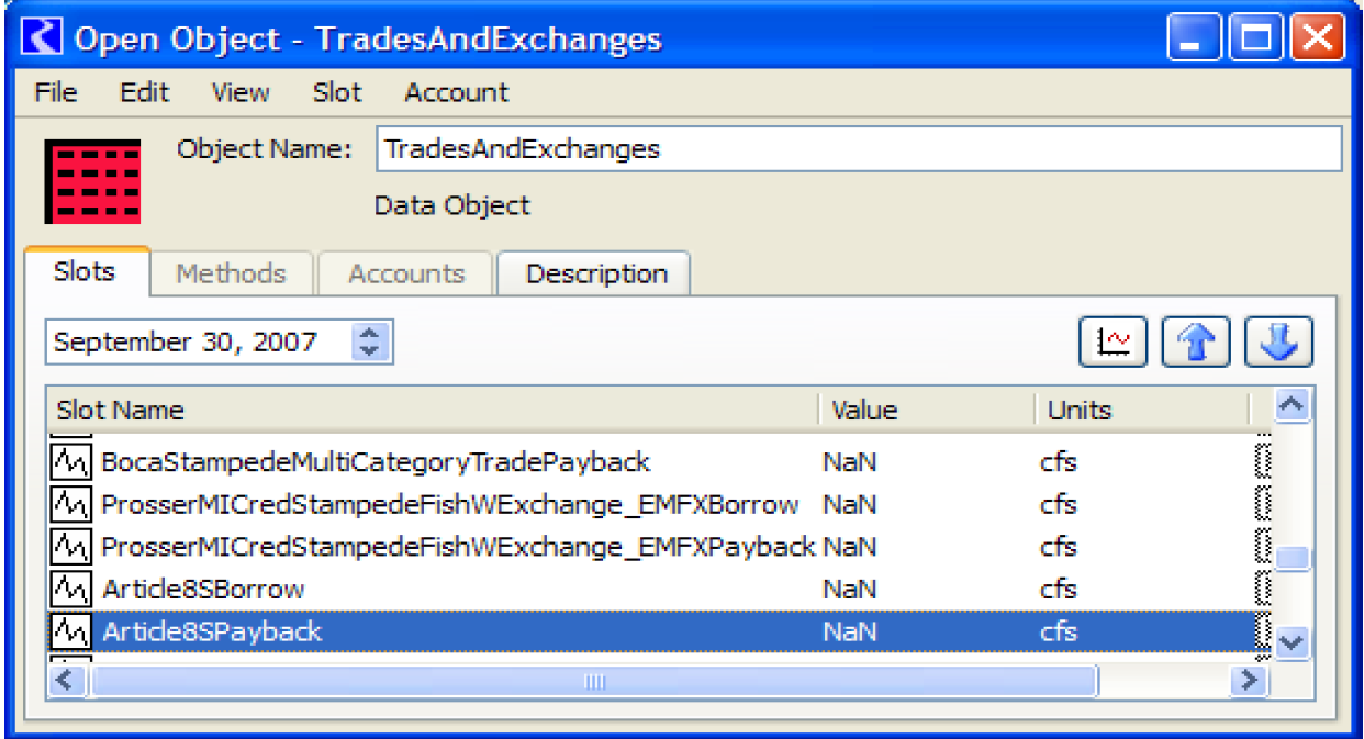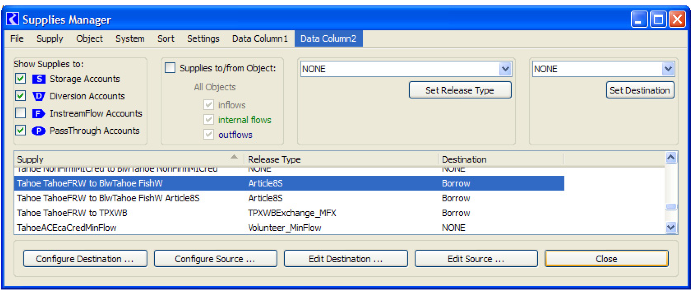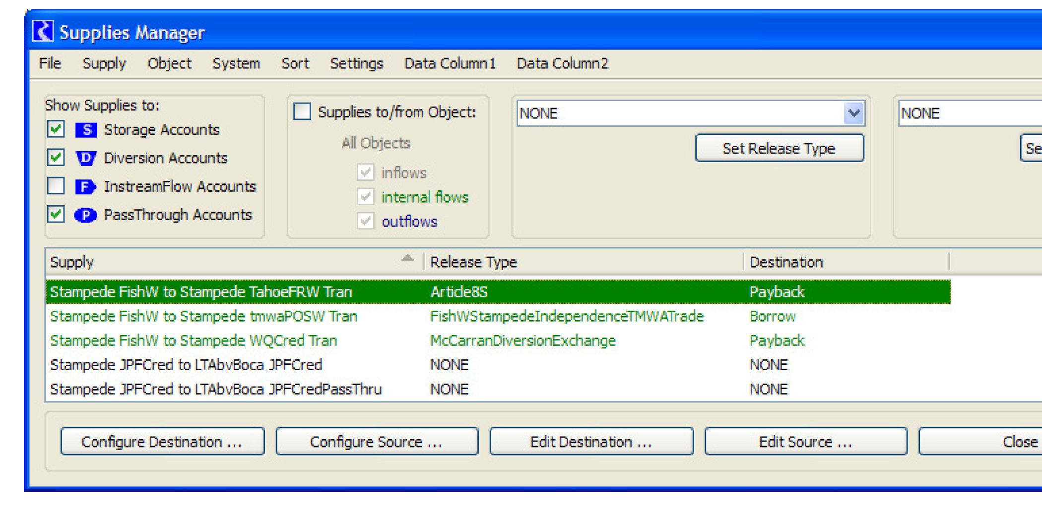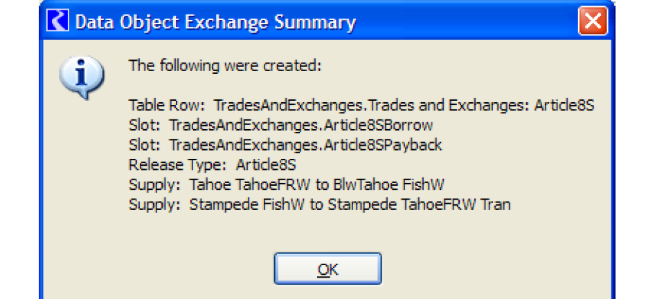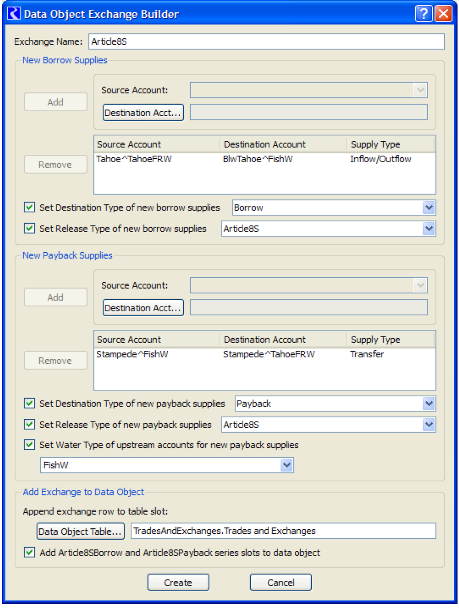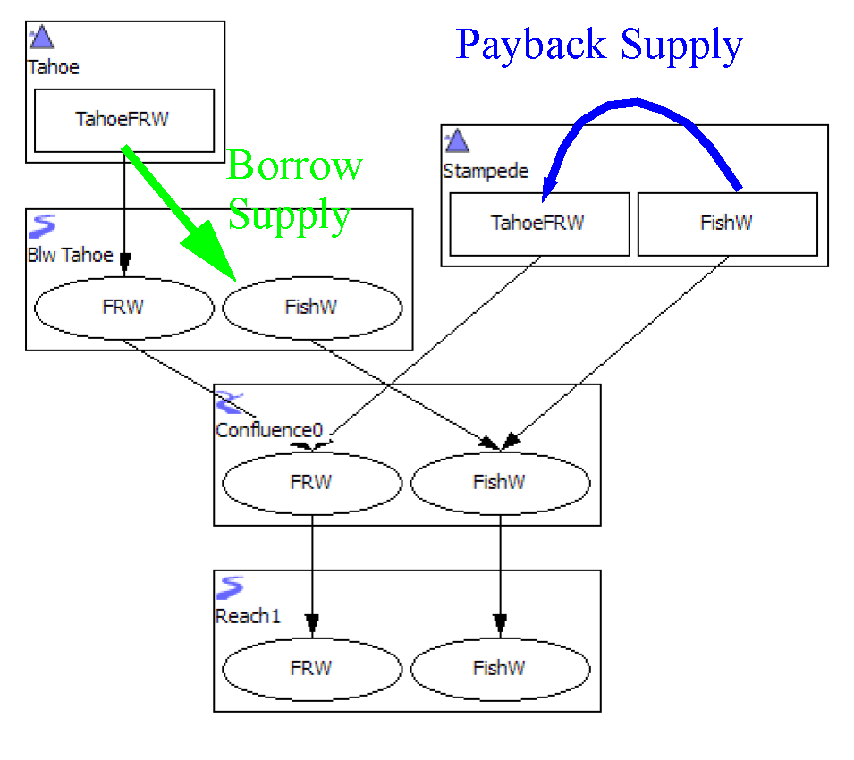 Figure 4.3 shows an example where a data object exchange (named Article8S) could be created to track water transfers. Water is borrowed from the TahoeFRW account on Tahoe reservoir to be released for fish and wildlife purposes. The water is paid back on Stampede reservoir by a transfer of water from a fish and wildlife account to a TahoeFRW account. This exchange requires that two new supplies be created, as shown by the colored arrows.