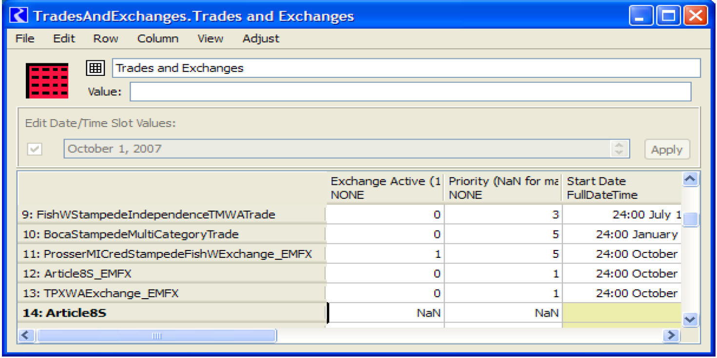 Figure 4.6 shows the row that was created on the Trades and Exchanges table slot for the new data object exchange. The user would need to fill in the column data to define the characteristics of the exchange.