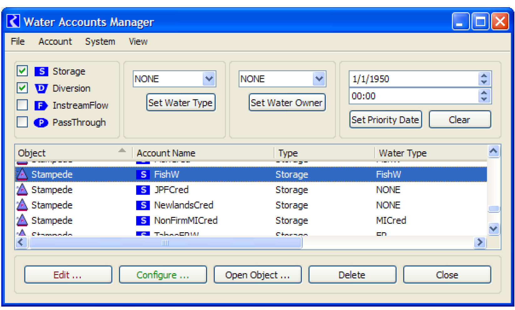 Figure 4.10 shows the water type for the upstream account of the payback supply has been set to FishW as specified in the Data Object Exchange Builder dialog.