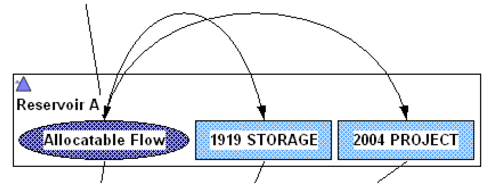 Allocations to Storage Accounts on in-stream reservoirs from the allocatable flow supply chain on the same reservoir are made through transfer type of links (supplies), as shown in Figure 6.2.