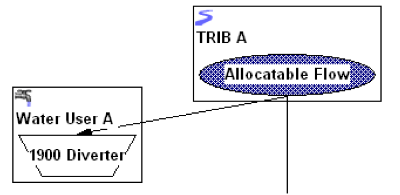 Figure 6.4  Allocatable Flow supply chain (blue) linked by supplies to a water user diversion account with a diversion right