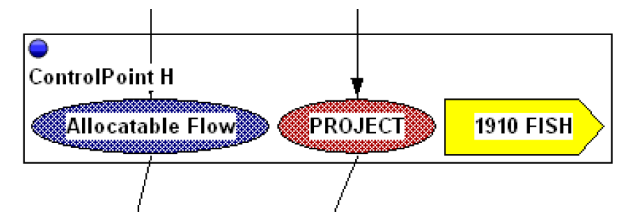 An instream flow right is modeled by an Instream Flow account on a Control Point Object. Shown is a a 1910 FISH Instream Flow Account. No supplies are necessary to link this account to other accounts on the Control Point; the Flow slot of the Instream Flow account contains the sum of the Inflows to all the passthrough accounts on the object.