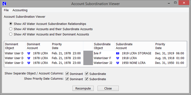 • Show All Water Account Subordination Relationships. Show only those accounts involved in a subordination relationship