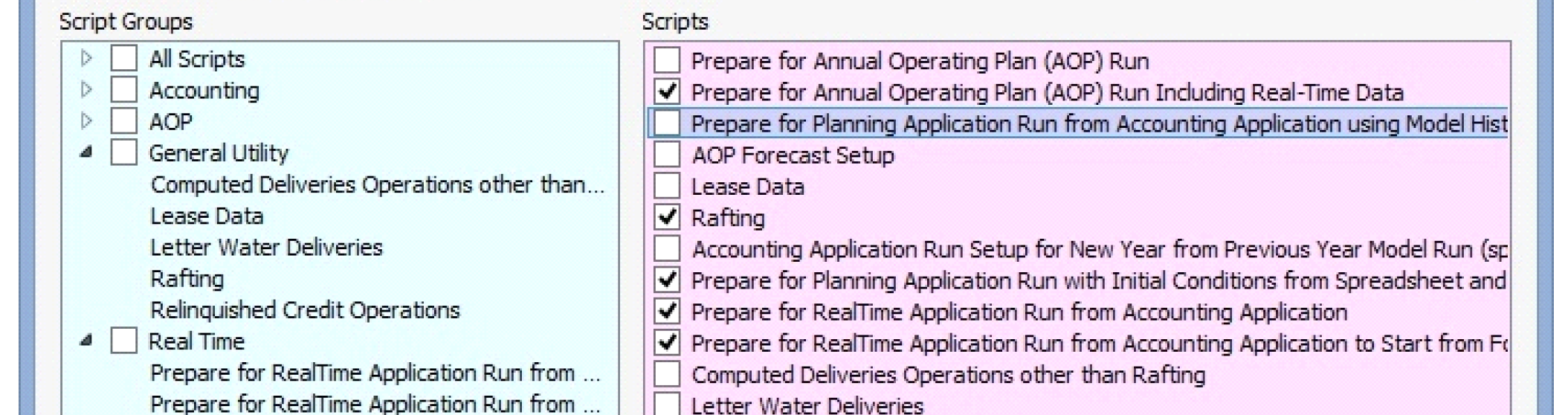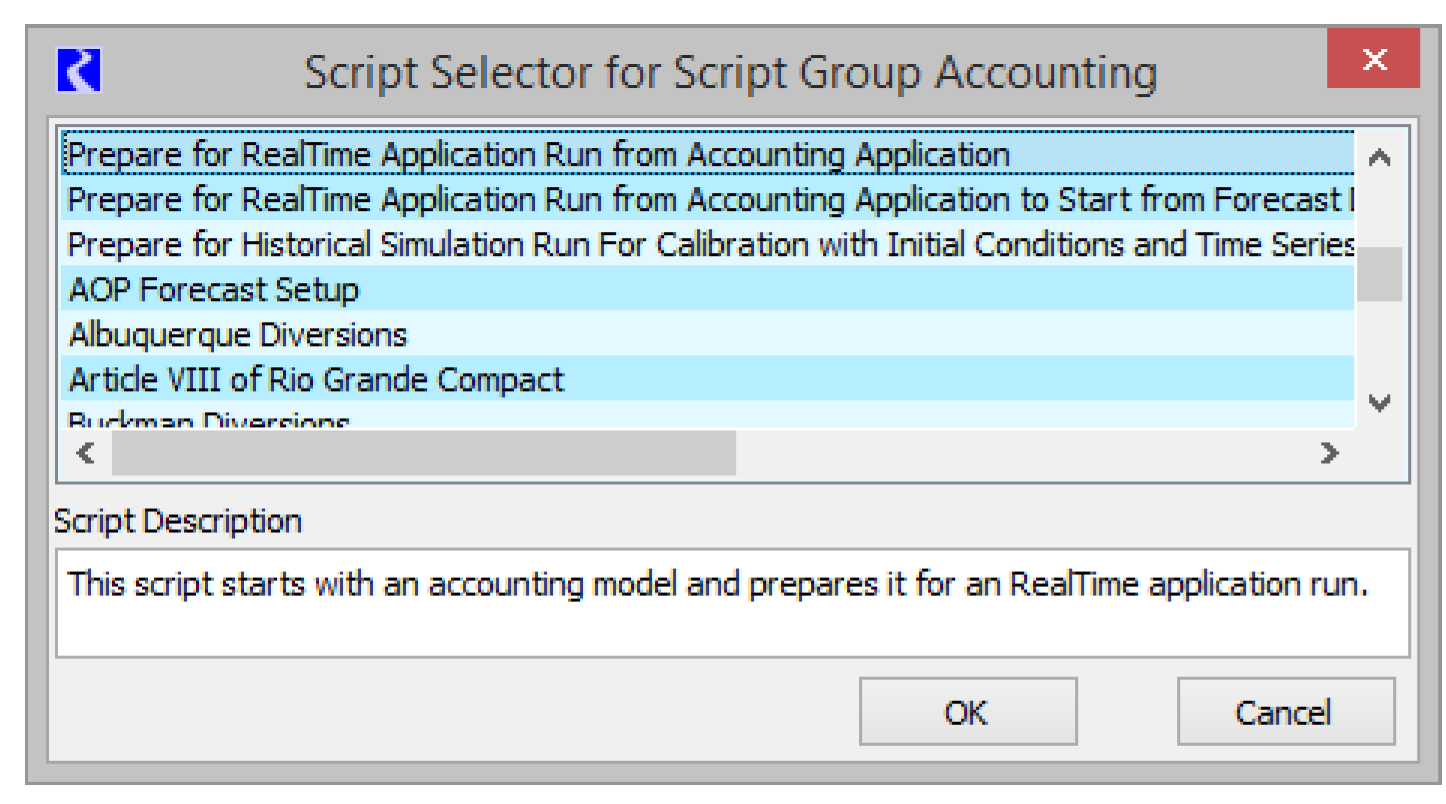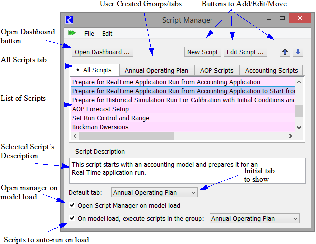 • Specify which script group tab is initially displayed by selecting a script from the Default tab menu. That tab is shown when the Script Manager window is initially opened (either upon model load or manually) within a RiverWare session.