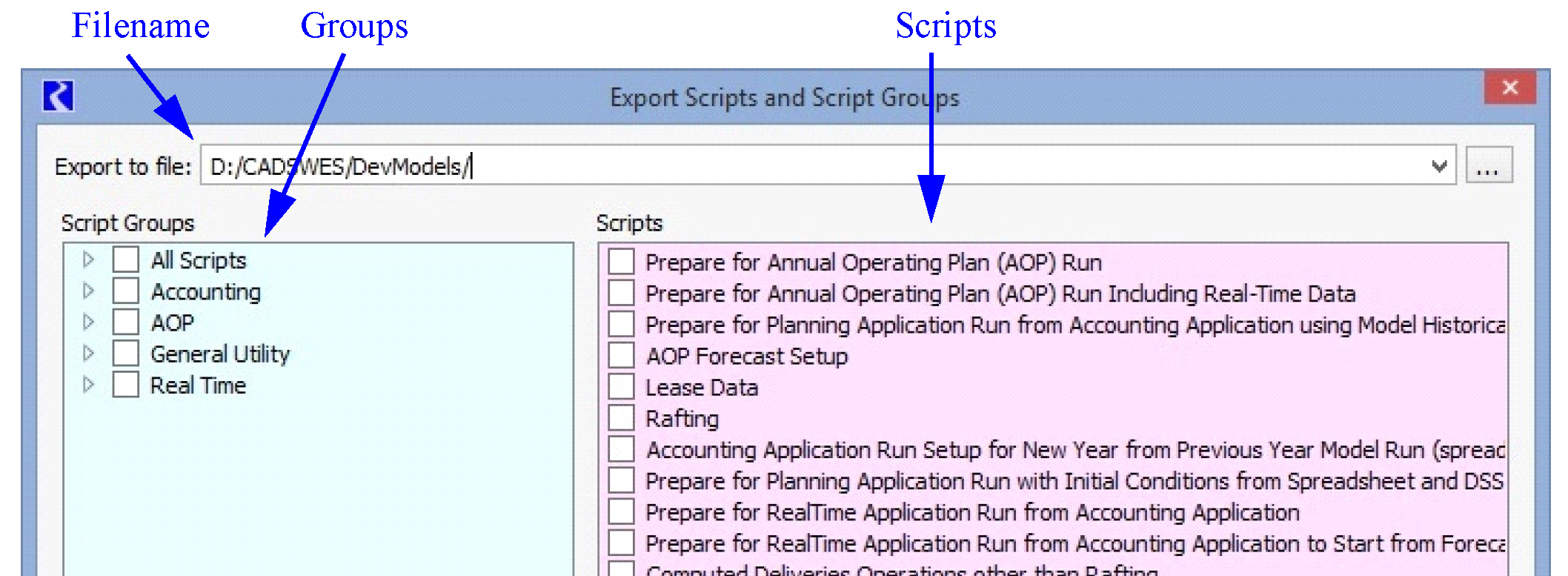 Note: To export all of the scripts in the model, simply select the All Scripts checkbox.