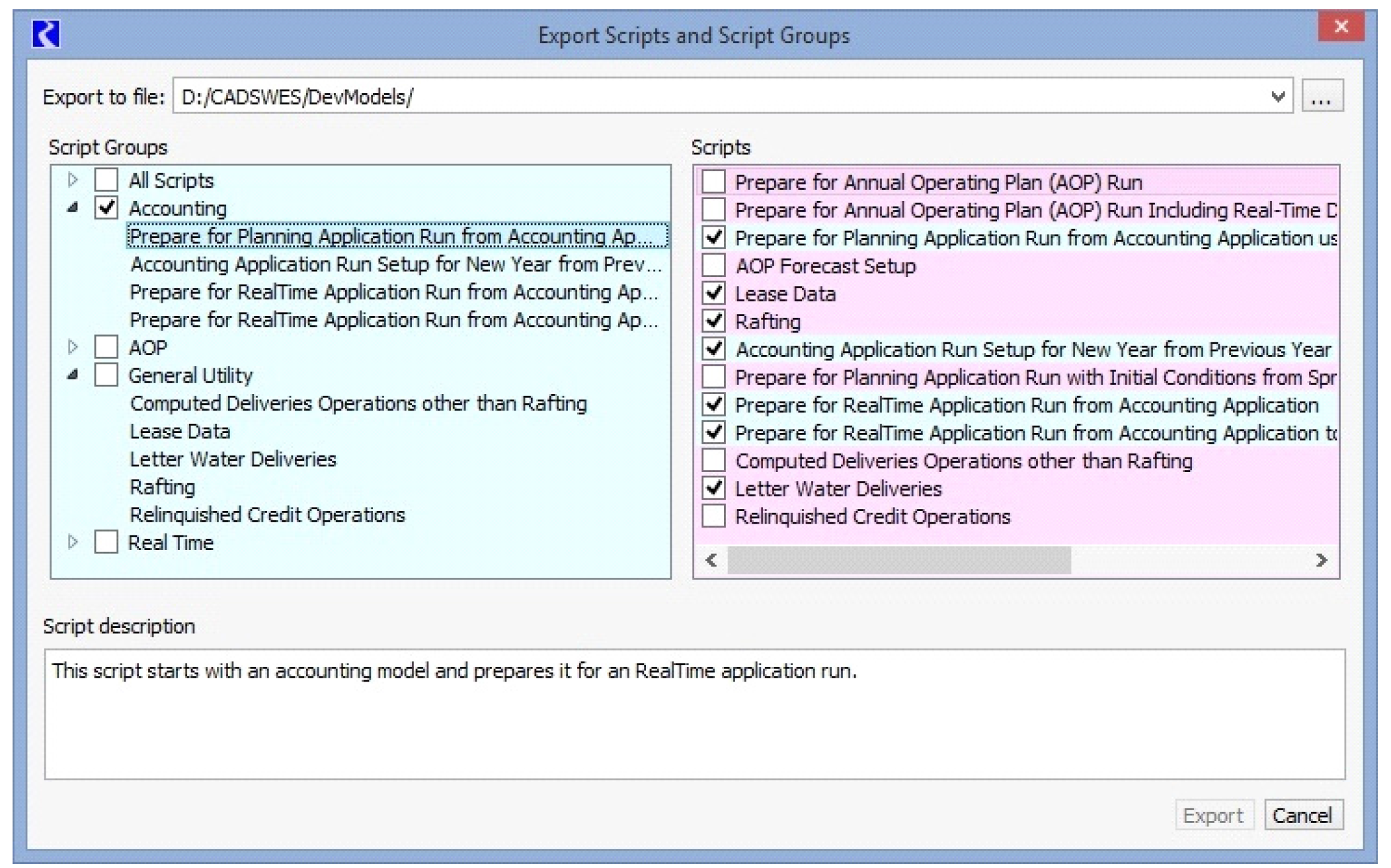 To export one or more Script Groups and the scripts referenced by the group, select the checkboxes in the left panel. All constituent scripts will be exported. Use the tree view arrows to see which scripts are part of the group. Also, as you select a group, the referenced scripts will also be checked and the background color will change in the Scripts panel on the right, as shown in