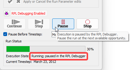 The Pause and Stop buttons on the Run Control also have new ornamentation to show that they are disabled when paused in the RPL Debugger, and the Run Status Execution State has improved wording to make it clear when the run is paused in the RPL Debugger.