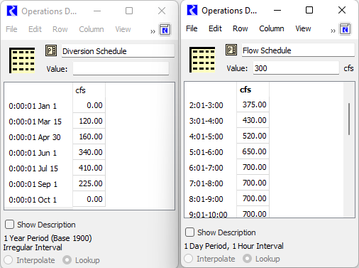 For periodic slots configured to use Lookup, the row labels have been improved to make the lookup intervals more clear. Examples are shown below for a slot with a one-year period and irregular interval on the left and a one-day period with a regular hourly interval on the right. Model behavior has not changed. Only the row labels have changed.