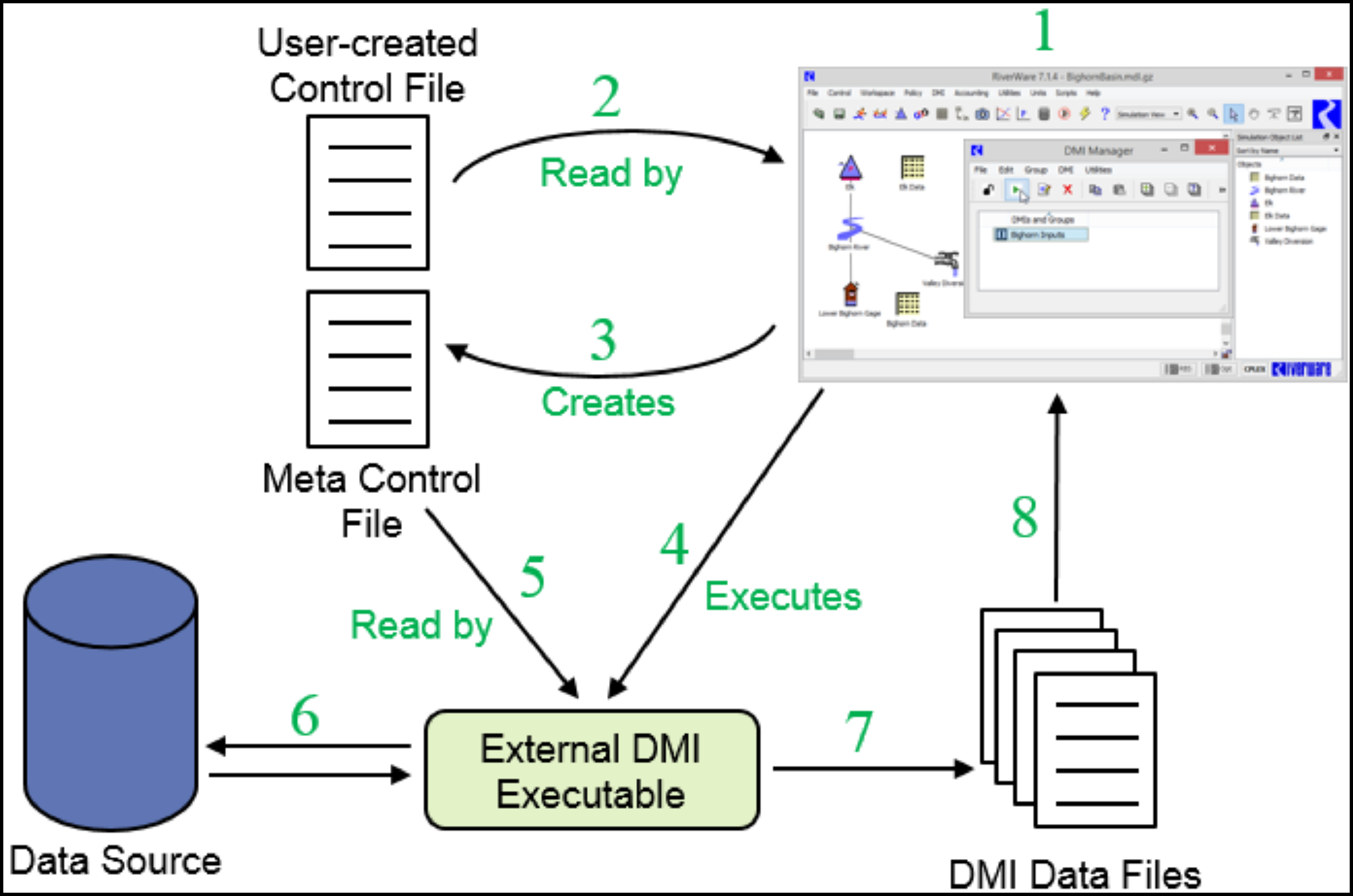 • The external DMI Executable is a separate software component which is called by the RiverWare DMI facility. For import DMIs, this external executable provides the data files which RiverWare loads into the model. For output DMIs, the external executable processes data files exported by RiverWare and performs such functions as saving the data in the database, reprocessing the data into reports, and preparing the data for use by statistical analysis programs.