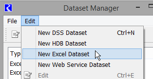 In RiverWare, datasets are defined and configured in the Dataset Manager as shown in Figure 4.17. The Dataset Manager is accessed from the Utilities, then Dataset menu on the DMI Manager. Selecting Edit, then New Excel Dataset, for example, adds a new dataset of that type.